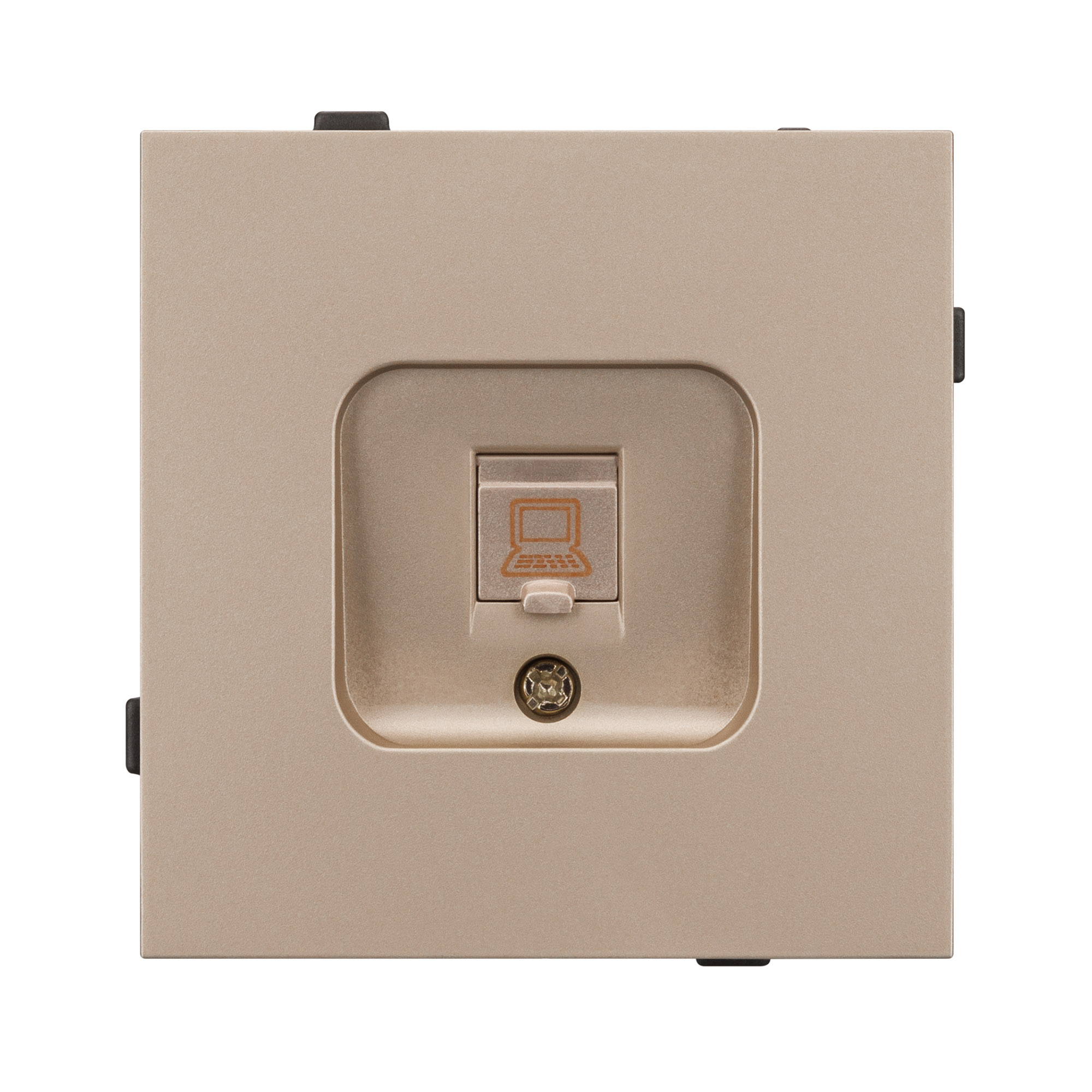 Механизм компьютерной розетки совместим с рамками серии TENDO, создает утонченный минималистичный вид. Скрытый тип монтажа позволяет гармонично встроить в интерьер любого современного дизайн-проекта. Видимая часть механизма выполнена из высококачественного пластика золотого цвета и имеет матовое покрытие. Выходной порт RJ-45 (Female) формата 8P8C соответствует категории 6 (Cat.6), что поддерживает высокоскоростные соединения до 10 Гбит/с на расстоянии до 55 метров. Откидная крышка защищает выходной порт от повреждения и загрязнения внешних контактов разъема. Контактная часть выполнена по технологии IPC (изоляционно–пробивающего контакта) с нанесением цветной маркировки схемы разводки на корпус, позволяя быстро и легко подсоединить механизм компьютерной розетки к большинству многожильных кабелей типа UTP (неэкранированные). Металлический суппорт окрашен порошковой краской в несколько слоев и выполнен из металла толщиной 1,5мм, что обеспечивает безопасность и уверенность в установке. А усиленные распорные (монтажные) лапки надежно фиксируют механизм в стандартном установочном подрозетнике. На каждой стороне суппорта размещены фиксирующие элементы, позволяющие комбинировать механизмы в системы до 5шт как горизонтально, так и вертикально, под соответствующую рамку.