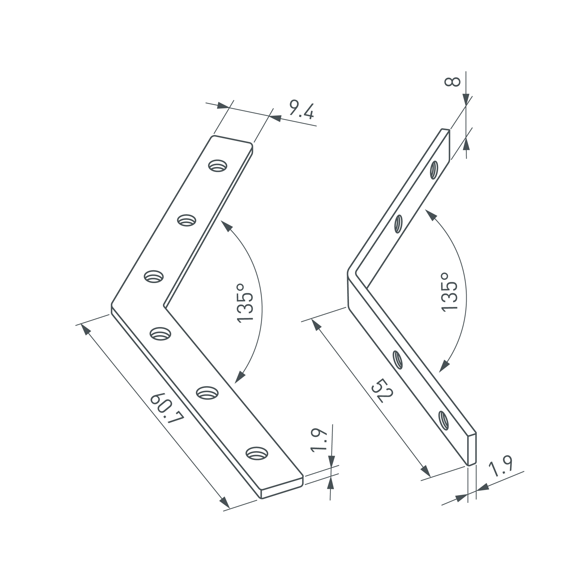 Угловой коннектор для соединения 2-х отрезков профиля LINE-6070 под углом 135°. Устанавливается в паз. В комплекте: соединитель внутренний - 2 шт., соединитель внешний - 2 шт., винт - 20 шт., шестигранный ключ - 1 шт. Цена за 1 комплект.