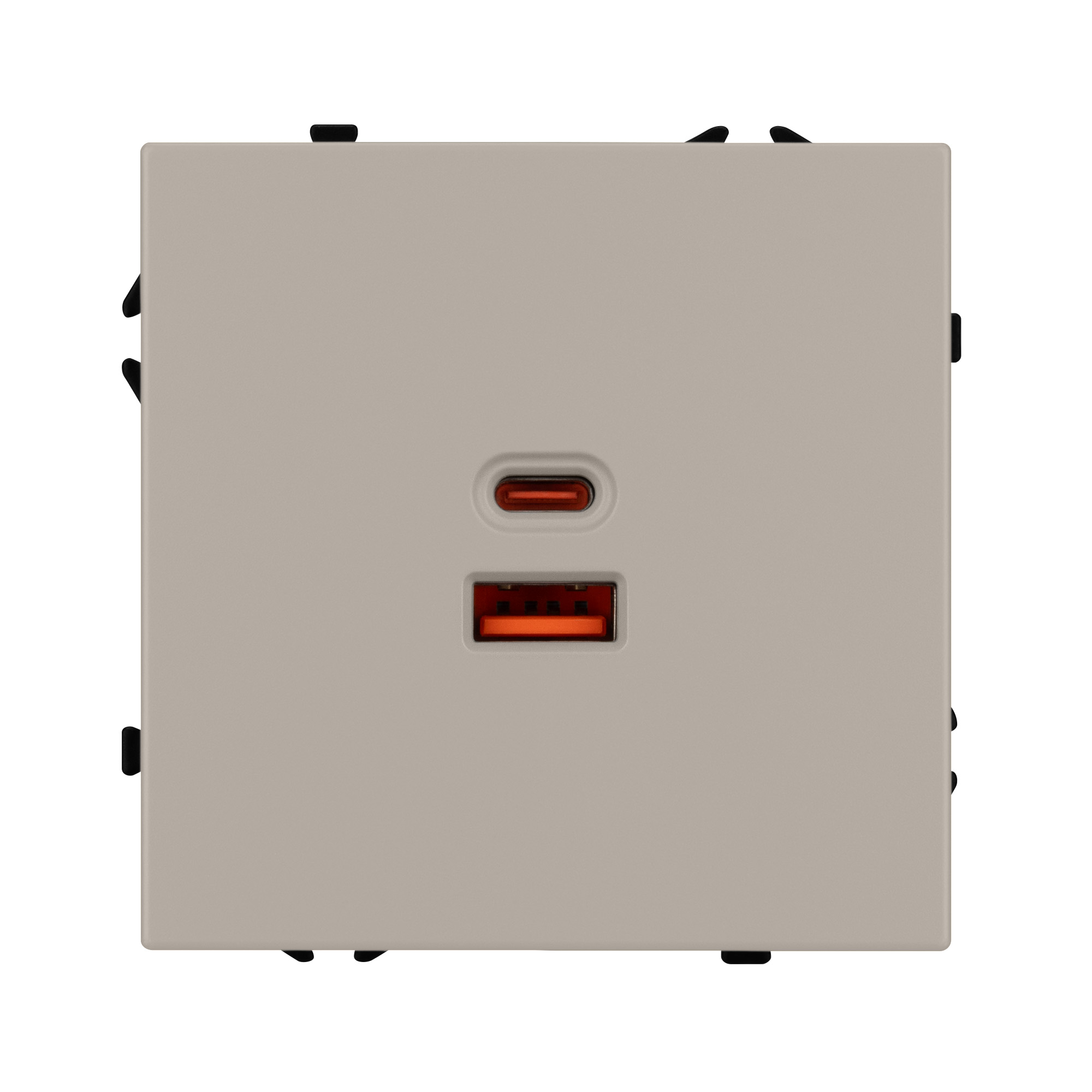 Строгие геометрические линии гармонично сочетаются с функциональностью продуманных механизмов, создавая идеальное решение для дизайн-проектов, где важны как эстетика, так и практичность. Механизм розетки с быстрой USB зарядкой, совместимый с рамками серии NOBE, создает утонченный минималистичный вид. Наличие USB Type A и Type C портов позволяет существенно сократить количество используемых розеточных постов под евровилку, сохраняя единую стилистику интерьера всего современного дизайн-проекта. Оба разъема поддерживают протокол быстрой зарядки Quick Charge QC 3.0, помимо этого для разъема Type C доступен протокол Power Delivery*. Выходные параметры для данных типов портов при этом составляют 30W и 65W соответственно. Видимая часть механизма выполнена из высококачественного пластика цвета кашемир и имеет Soft-Touch покрытие, что придает изделию приятные тактильные ощущения и стильный внешний вид. Контактная часть присоединяется при помощи винтовых зажимов, позволяя надежно подсоединить механизм выключателя к питающим элементам. Суппорт окрашен в черный матовый цвет под основу механизма и выполнен из металла толщиной 1,5мм, что обеспечивает безопасность и уверенность в установке. На каждой стороне суппорта размещены фиксирующие элементы, позволяющие комбинировать механизмы в системы до 5шт как горизонтально, так и вертикально. *Для активации функции быстрой зарядки необходимо использовать специализированный зарядный кабель, который предназначен для работы с зарядными устройствами повышенной мощности.