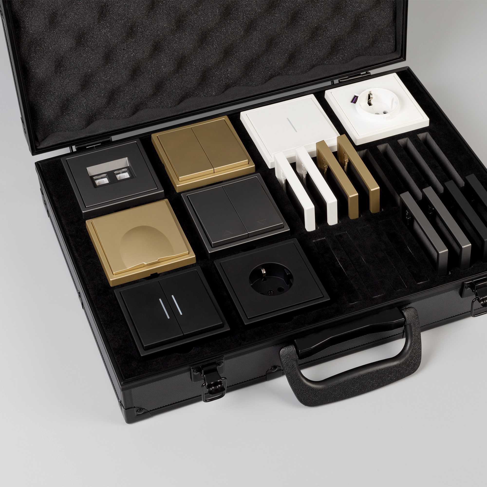 Демо-кейс с наполнением для демонстрации продукции ЭУИ серии NOBE. Материал: Алюминий + вспененный полиуретан. Ячейки для размещения: 8 мест под механизмы и 16 мест под однопостовые рамки. Габаритные размеры кейса: 280*400*100мм. Размер под логотип: 260*380мм