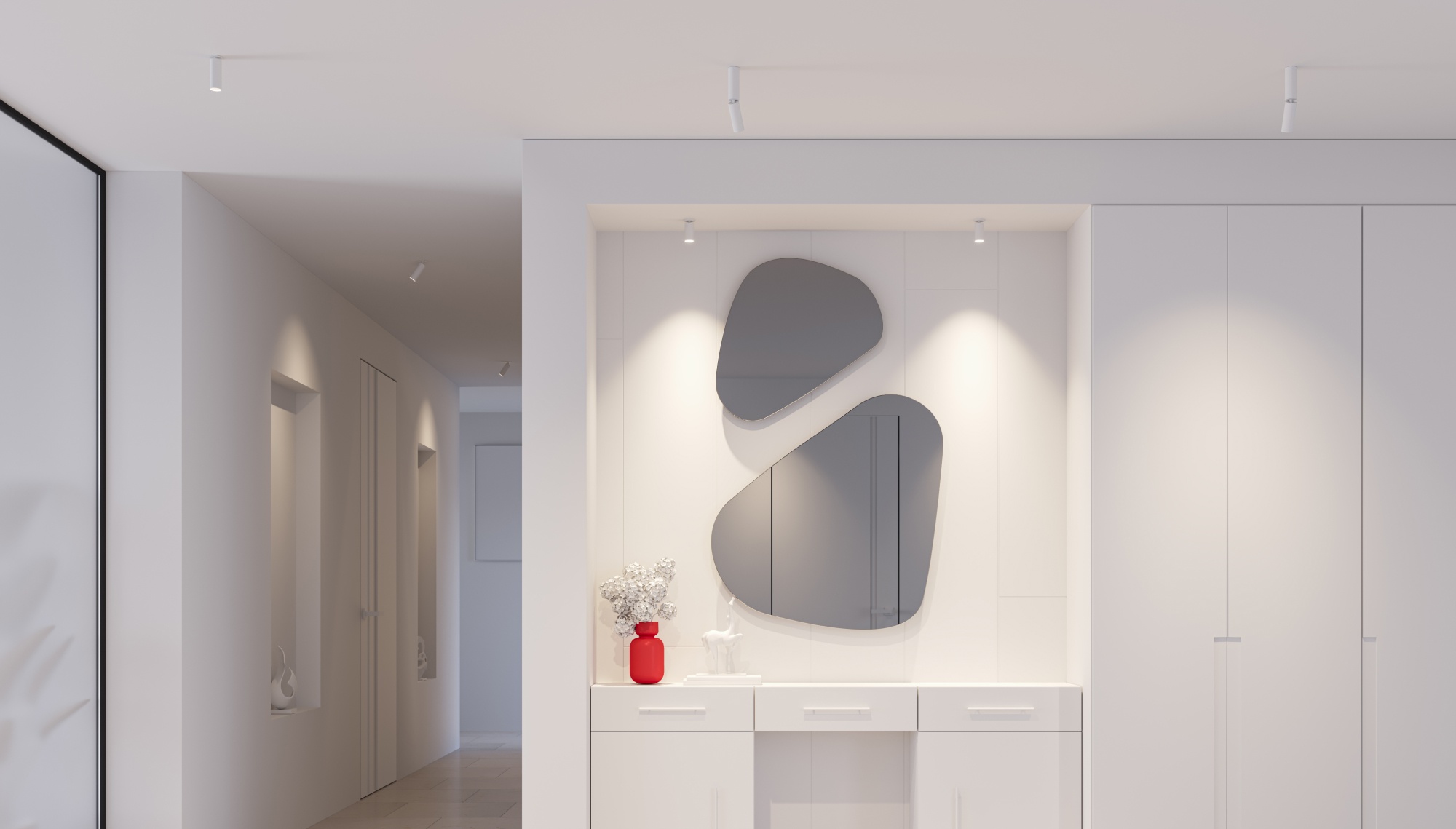 В серии представлено три вида корпуса, что дает возможность комбинировать разные типы светильников одной серии для создания интересных решений: накладной поворотно-откидной, встраиваемый поворотно-откидной и встраиваемый под шпаклевку без внешней рамки с телескопическим выдвижением светового модуля. Корпус поворотных моделей вращается вокруг своей оси на 350° и отклоняется по вертикали на 90°.