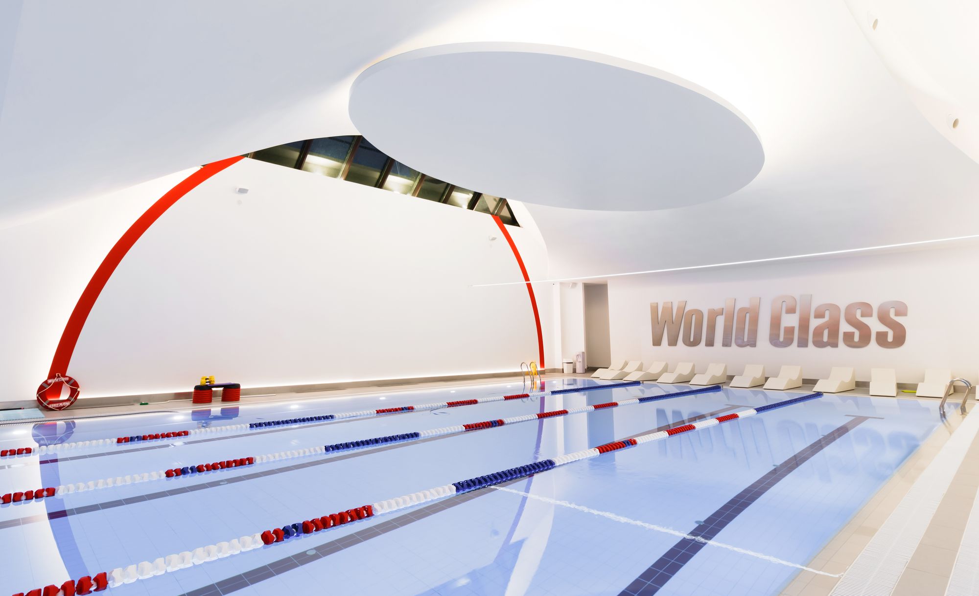 Световой дизайн построен на контрасте белого и красного, широких световых полос и тонких линий света. Линейные светильники с полупрозрачными экранами идеальны для основного освещения. Декоративная подсветка зеркал и других элементов интерьера выполнена светодиодными лентами дневного белого свечения. Границы потолка и стен в фитнес-зонах эффектно подчеркнуты линиями света.