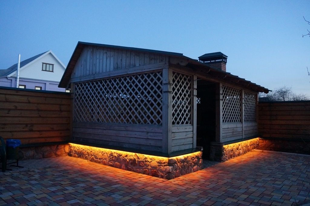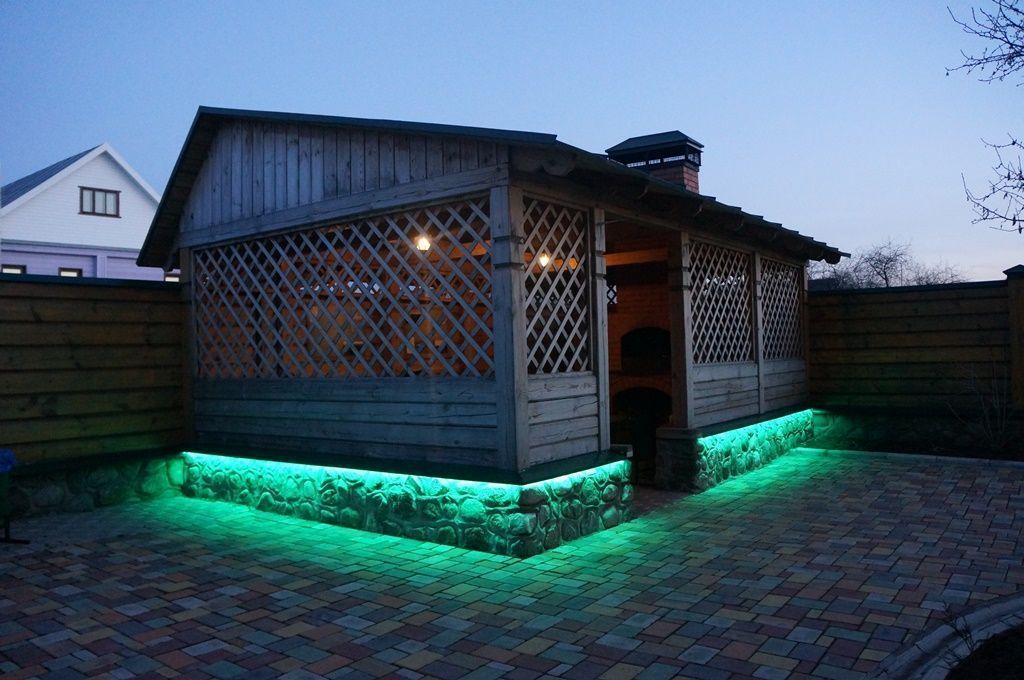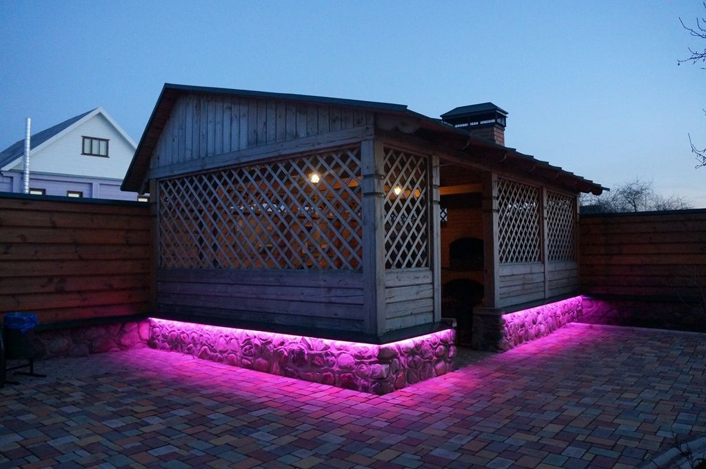 Простая подсветка фасада многоцветной светодиодной лентой RGB от компании arlight® в разы улучшила вид простой загородной беседки.