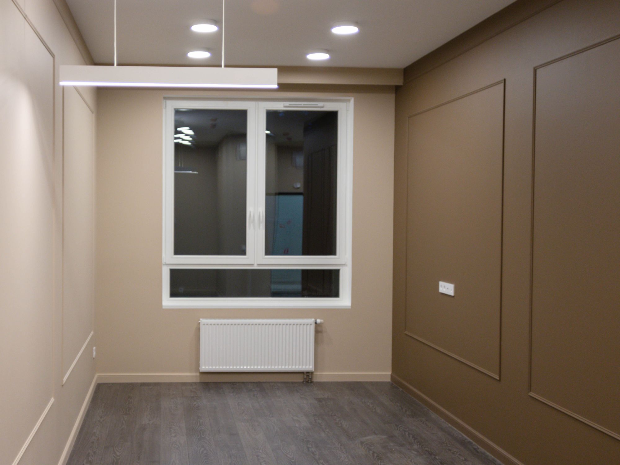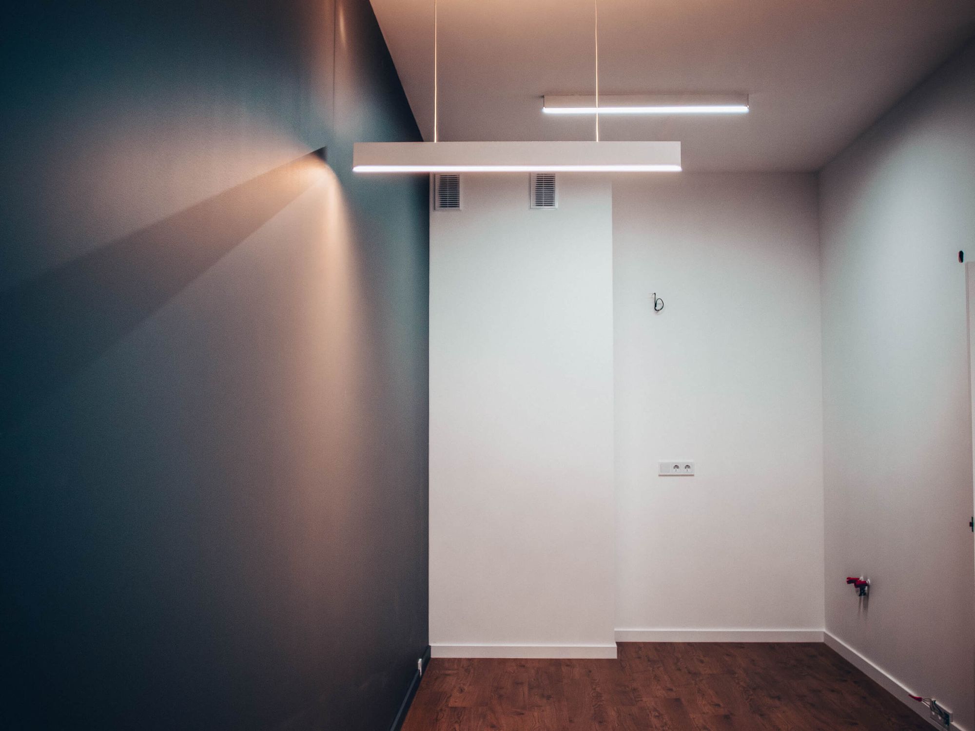 В лаконичных интерьерах лаунж-студий аккуратно и стильно смотрятся накладные круглые и подвесные линейные светильники. Они не только обеспечивают хороший уровень освещенности, но и выглядят как оригинальный элемент интерьера. Для подсветки потолка использована светодиодная лента, которая проходит по его границе плавными изгибами и добавляет пространству интересных световых деталей.